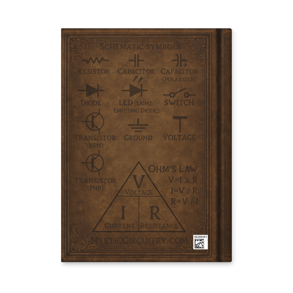 Crack open the matte-laminated cover and you’ll find 150 lined pages ready for ideas, diagrams, or secret raccoon blueprints. The flexible sewn spine lays flat for easy scribbling, while perforated pages let you tear out your best work to share (or hide). On the back cover, you’ll discover schematic symbols and Ohm’s Law formulas—an alchemist’s cheat sheet for every inventor, solder-wizard, or dreamer of impossible machines.